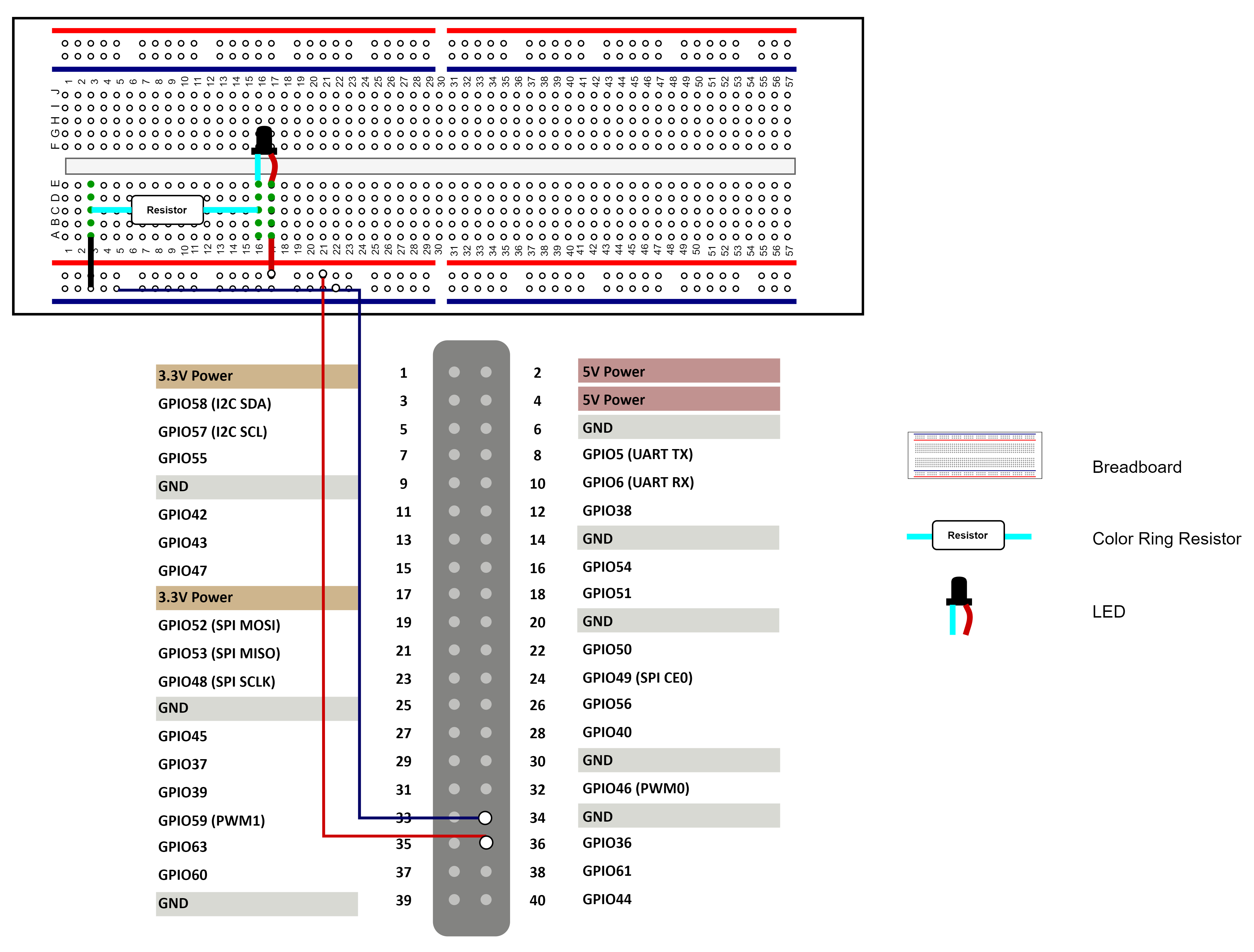 The following table and figure describe how to connect LED to the 40-pin GPIO Header: