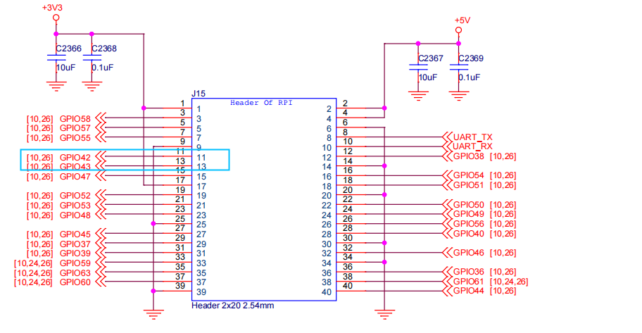 Linux uses UART0 as the system serial port, while RT-Thread uses UART2 as the system serial port. In this application note, pin11 and pin13 on 40-pin GPIO of VisionFive 2/VisionFive 2 Lite are used as RX/TX pins. The following shows the circuit diagram of the VisionFive 2/VisionFive 2 Lite 40-pin GPIO.