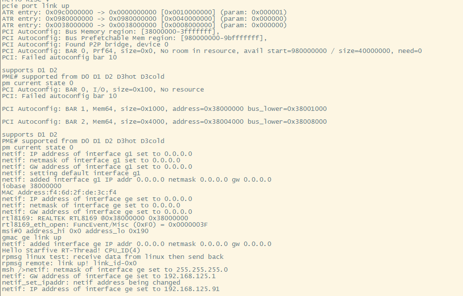 The following figure shows the PCIe driver initialization printing and RTL8161 network