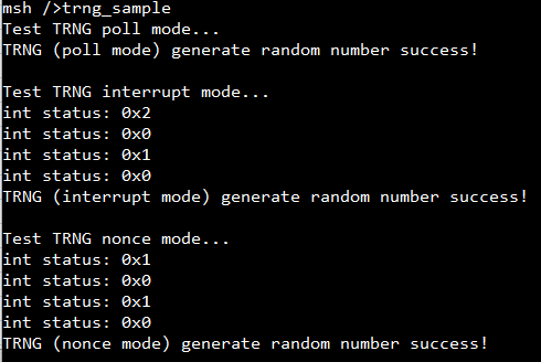 Test description: The test program calls the TRNG module to generate random numbers in poll mode, interrupt mode, and nonce mode.