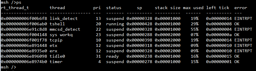 For example, enter the command ps to display the currently running threads of the system.Figure 1. Running Threads