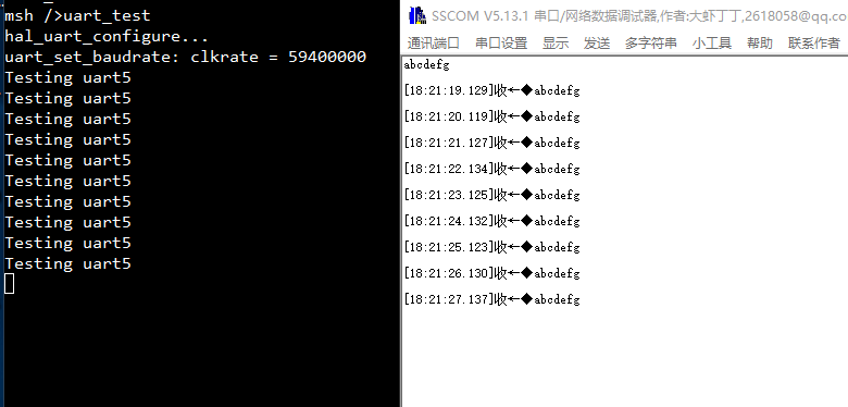 There is a test case for UART5 in the RTOS, which requires opening the serial debugging assistant on the PC. RT-Thread sends a string every second via UART5 and the debugging assistant will receive that string.