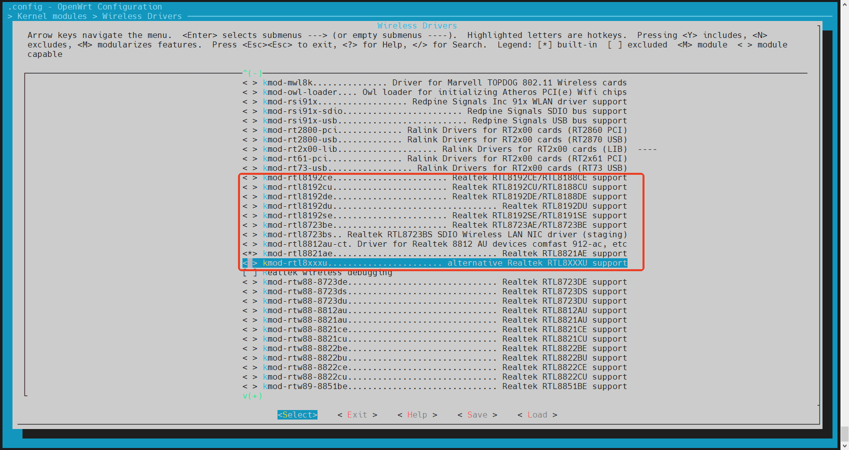 - Select kmod-cfg80211, kmod-mac80211, kmod-rtl8821ae in the