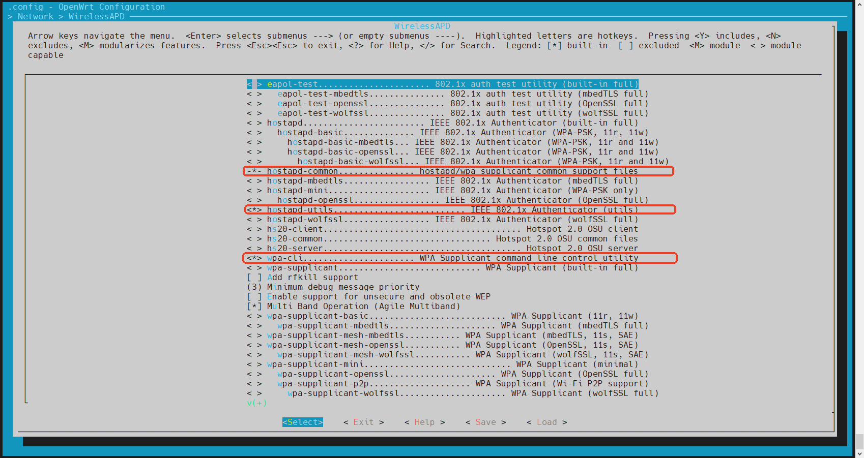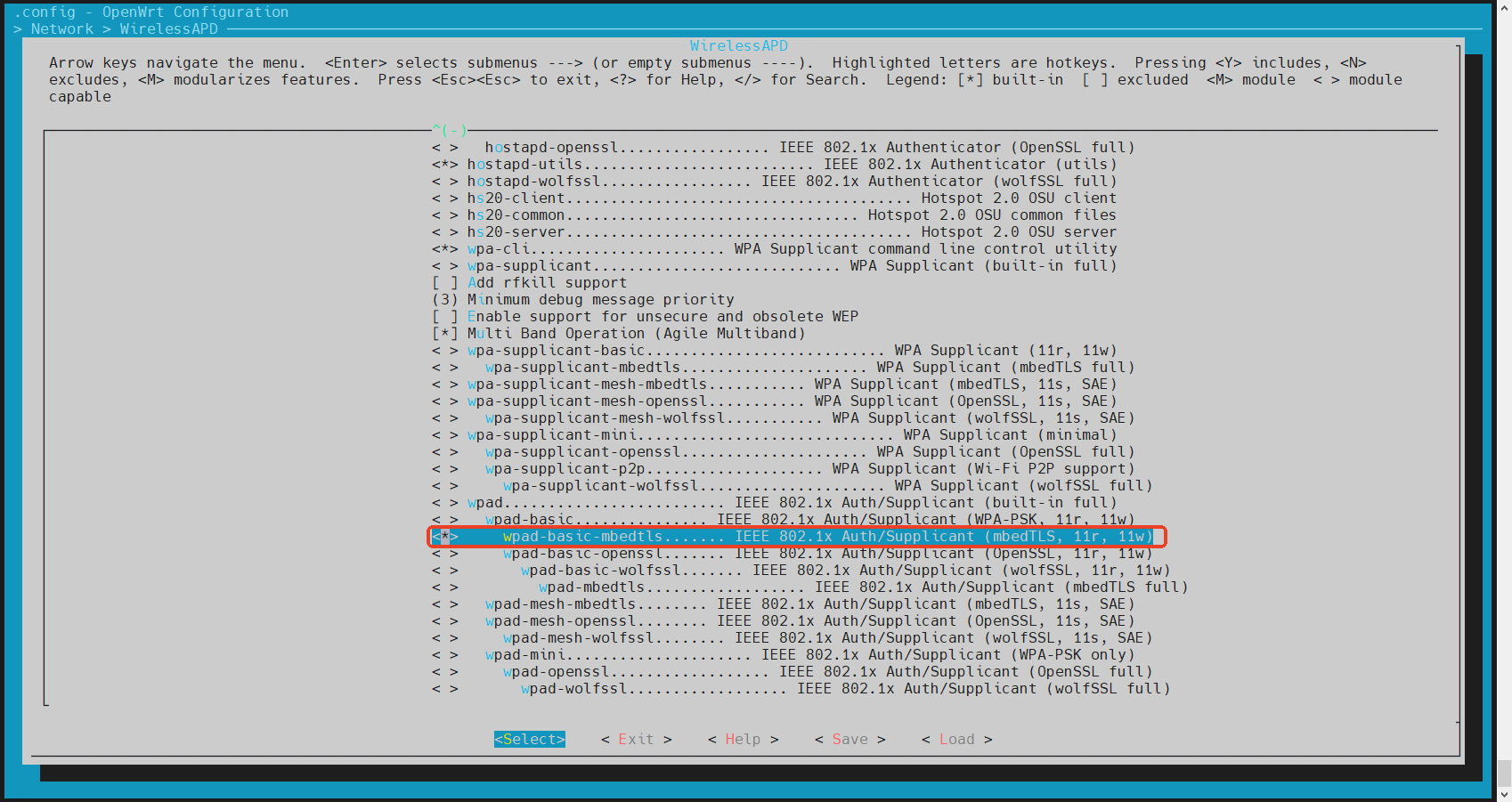 - Select wpad-basic-mbedtls, hostapd-common, wpa-cli,