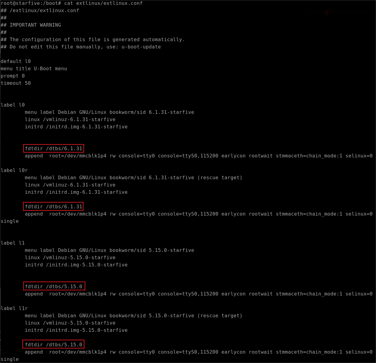 It can be seen that the fdtdir in each startup item is set to /dtbs. Combined with the configuration in uEnv.txt, it can be seen that after powering on, the device tree file will be loaded according to the path of /boot/dtbs/starfive/jh7110-visionfive-v2.dtb, which obviously does not match the directory structure under the dtbs/ path. Therefore, the fdtdir for the startup options of label l0, label l0r, label l1, and label l1r should be modified to the state before installing the Debian package:Figure 7. Modify fdtdir