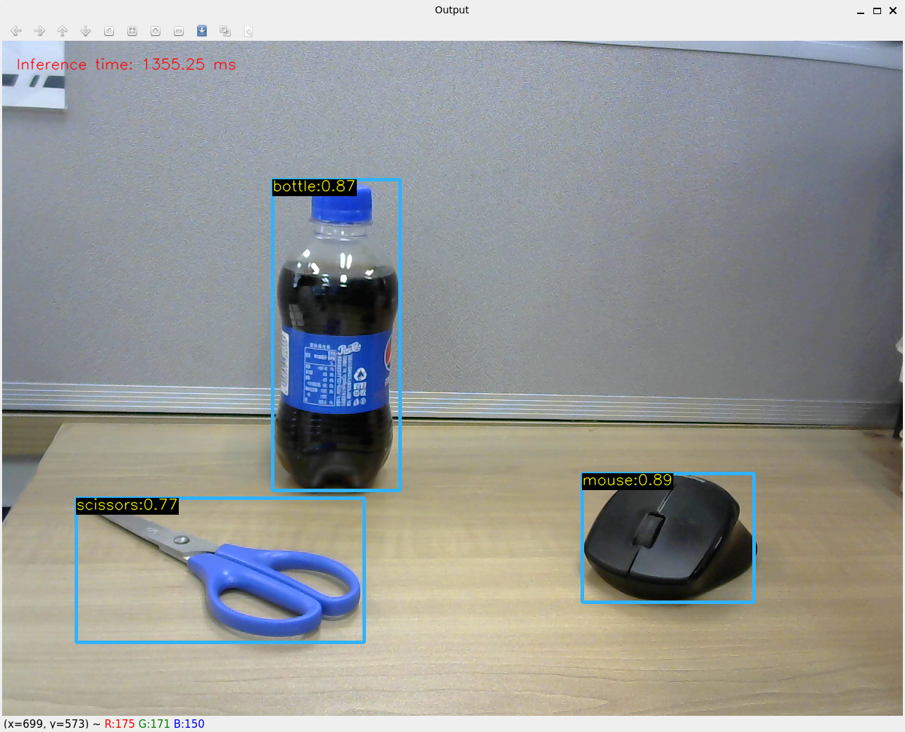 - The inference time per frame is displayed on the upper left corner, which translates to an approximate inference frame rate of 0.6 to 1.1 fps;